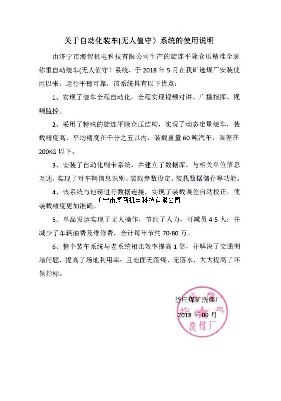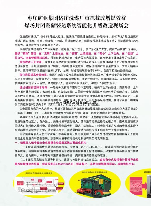 本產(chǎn)品一經(jīng)推出即獲得各大設(shè)計(jì)院及用戶(hù)的一致好評(píng),率先在棗礦集團(tuán)岱莊煤礦取得成功應(yīng)用,2018年9月受邀參加了《棗礦集團(tuán)煤場(chǎng)封閉暨儲(chǔ)裝運(yùn)系統(tǒng)智能化升級(jí)改造現(xiàn)場(chǎng)會(huì)》,智能裝車(chē)系統(tǒng)得到了充分肯定!我司憑借雄厚的加工制造實(shí)力及過(guò)硬的創(chuàng)新技術(shù)能力,勢(shì)必為運(yùn)輸稱(chēng)重系統(tǒng)、快速計(jì)量裝車(chē)系統(tǒng)帶來(lái)又一次的技術(shù)創(chuàng)新變革。