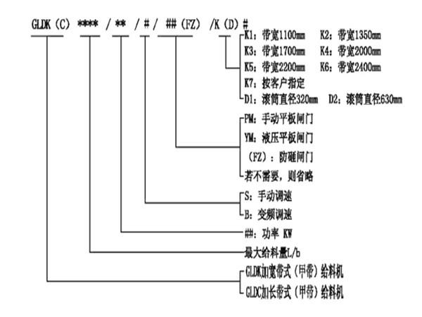 加寬加長帶式(甲帶)給料機(jī)型號說明: