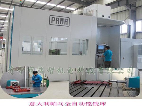 PAMA 工作臺式鏜銑加工中心,型號SPEEDMAT 3000 130 TR16,本機床為意大利PAMA品牌,鏜軸直徑φ130mm,主軸箱垂直行程2500mm,工作臺水平行程3000mm,立柱行程2300mm,鏜軸行程800mm,回轉工作臺尺寸1800 x 2200mm, 承重16t,工件最大回轉直徑3000mm,(X,Y,Z,W)軸加工進給速度0.5 ~ 15000 mm/min。